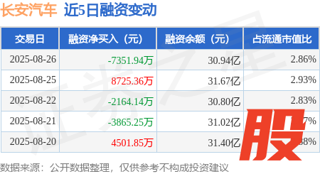 本站消息,8月26日,长安汽车(000625)融资买入1.6亿元,融资偿还2.33亿元,融资净卖出7351.94万元,融资余额30.94亿元。