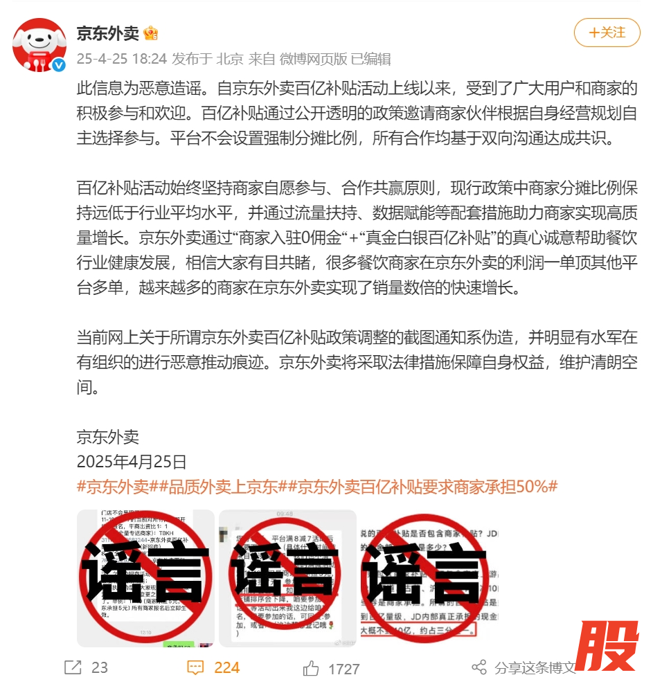 4月25日,针对部分媒体报道“京东外卖百亿补贴要求商家承担50%”一事,京东外卖发文称,此信息为恶意造谣。百亿补贴通过公开透明的政策邀请商家伙伴根据自身经营规划自主选择参与。平台不会设置强制分摊比例,所有合作均基于双向沟通达成共识。